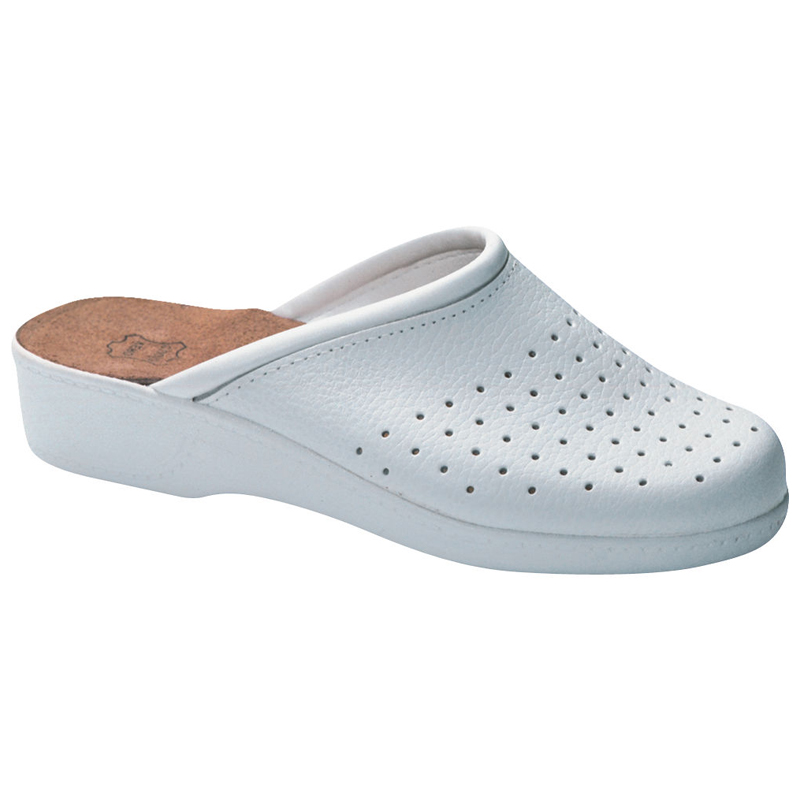 Pianella in pelle traforata bianca ed imbottita sul bordo con suola in poliuretano.